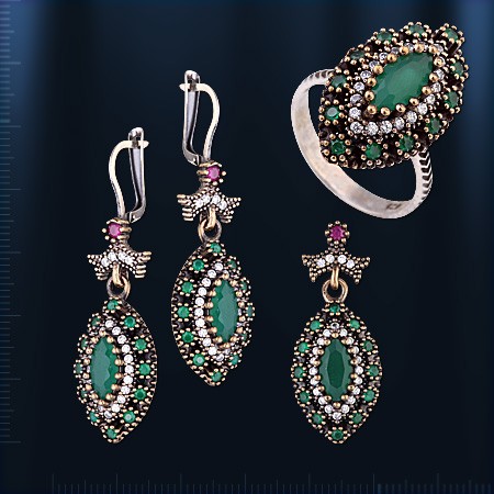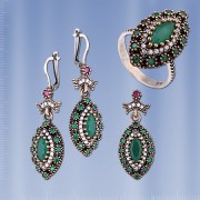 Серьги-подвески с изумрудами (10 х 5 мм), изумрудами ¢ 2 мм., рубинами ¢ 2 мм., цирконами ¢ 1 мм. Высота серёг пр.50 мм., ширина пр.15 мм.