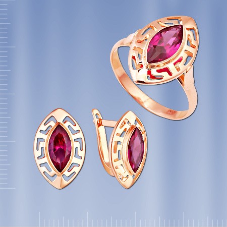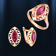 Гарнитур из красного русского золота 585 пробы с рубином состоит из кольца и серёг.