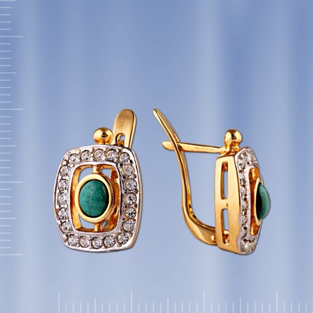 Серьги со вставкой малахита (5 х 4 мм), цирконий ¢ 1 мм. Покрытие -позолота. Элегантно и симпатично!