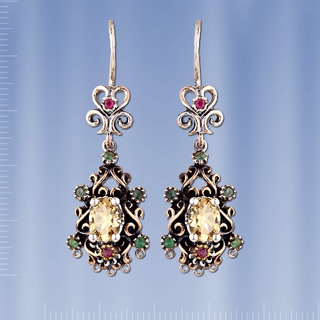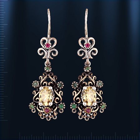 Вставки: цитрин (8 х 5 мм), изумруды (¢ 2 мм), рубины (¢ 2 мм).  Высота пр.50 мм., ширина пр. 15 мм.