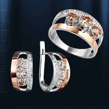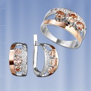 Изящный ювелирный гарнитур выполнен из серебра 875 пробы со вставками из красного русского золота 585 пробы. Вставка : кубический цирконий ¢ 5 мм., ¢ 4 мм., ¢ 1 мм