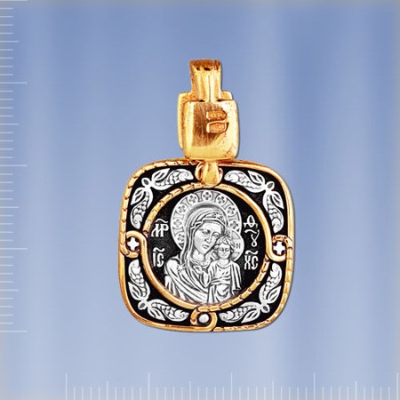 Казанская икона Божией Матери из чернённого серебра 925 пробы позолоченный 999 пробы. Высота с ушком пр.34 мм., ширина пр.22 мм., толщина пр. 3 мм. Размеры ушка под цепочку пр. 10 х 5 мм