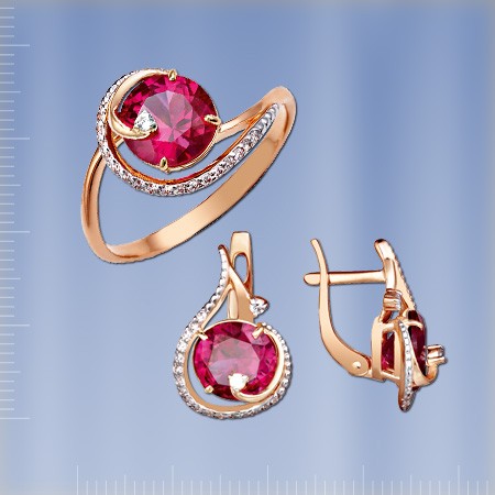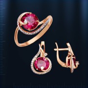 Set der russischen Rot/Weißgold 585°mit Korund Rubin besteht  aus Ohrringer OR01646 und Ring R01529