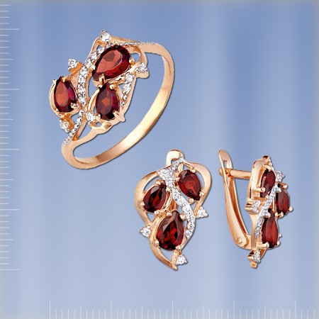 Set der russischen Rot/Weißgold 585° mit Granat besteht aus Ohrringer OR01840 und Ring R01726