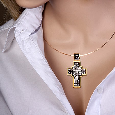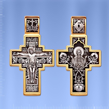 Распятие Христово. Господь Вседержитель.Икона Божией Матери Умиление Серафимо-Дивеевская. Православный крест из чернённого серебра 925 пробы позолоченный 999 пробы.