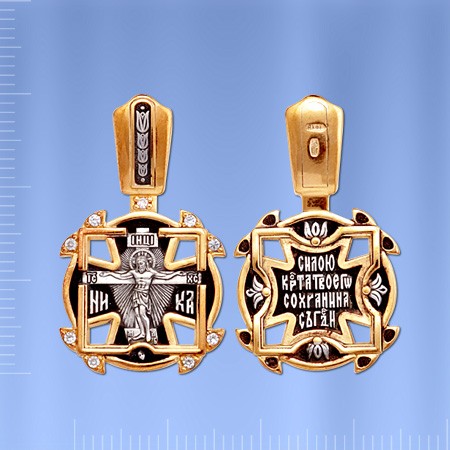 На лицевой стороне креста изображено Распятие Господа Иисуса Христа, окруженное сияющей славой. На обороте помещена короткая просительная молитва : "Силою креста Твоего сохрани нас, Господи"