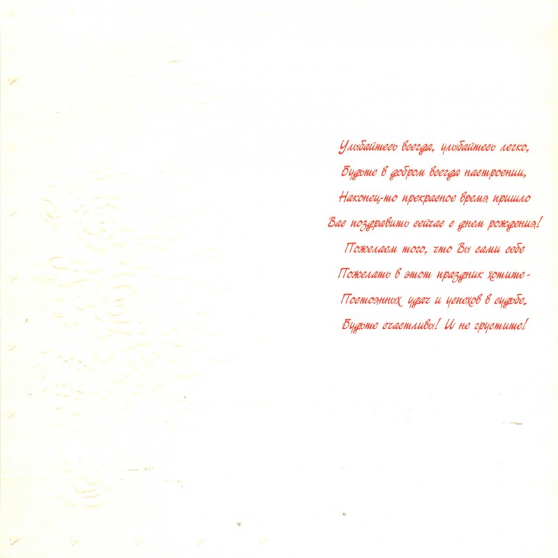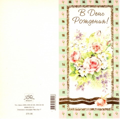 Поздравительная открытка "С Днем Рождения!" Размеры: 105х210мм Во внутренней стороне открытки имеется поздравительный текст. Вы любите дарить и получать подарки? А как на счет открыток? Вы радуетесь, когда Вам преподносят необычную почтовую карточку с лучшими пожеланиями от души? Порадуйте себя, своих близких и любимых людей — закажите оригинальные поздравительные открытки на сайте интернет-магазина. Открытка никого не оставит равнодушной.Согласитесь, что иногда человеку достаточно немного внимания, улыбки и небольшого презента, чтобы почувствовать себя самым счастливым во всей Вселенной. Сделайте шаг навстречу к тому, кто нуждается в Вас и хочет чувствовать тепло Вашего сердца!