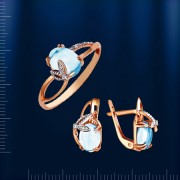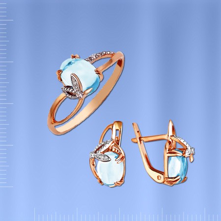 Милое кольцо выполнено из красного и белого русского золота 585 пробы с небесно - голубым топазом (кабошон овал 8 х 6 мм., 0.343) и сверкающими цирконами (¢ 1 мм) алмазной огранки, являющимися идеальной имитацией бриллианта