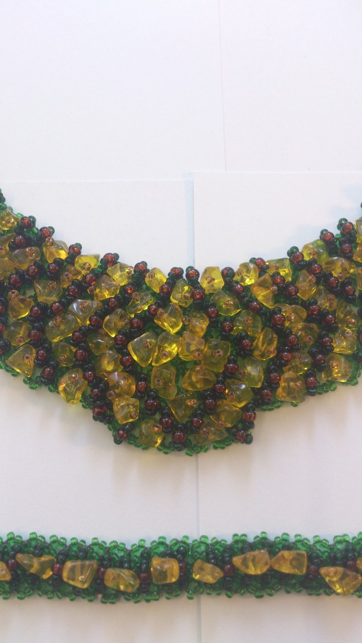 Шикарный, объёмистый бисерный гарнитур ручной работы.Бусины и самоцветы мерцают, переливаясь в лучах цвета.К сожалению фотографии не передают истинный цвет и блеск. Материалы: бисер и янтарь. Гарнитур включает в себя колье и браслет. Длина колье: 42 см, ширина:от 1,5 см до 4 см. Длина браслета:17,5см, ширина:1,2 см. Шикарный, объемистый, бисерный гарнитур ручной работы.