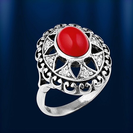 Ring aus dem geschwärztem Silber 925 mit synthetische Koralle (10 x 8 mm).