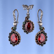 Подвеска со вставкой граната (10,0 х 8,0 мм), 7 изумрудов ¢ 2,0 мм. Высота подвески с ушком пр.34,0 мм., ширина пр.15,0 мм.