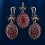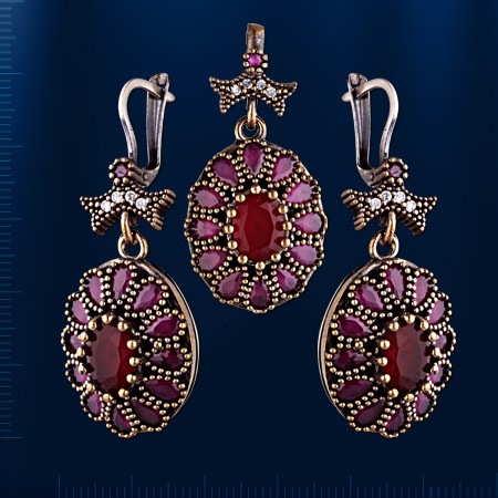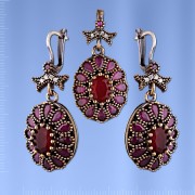 Set aus geschwärztem  Silber 925° mit Granat (10 x 8 mm), Rubinen (5 x 3 mm), Fianiten ¢ 1 mm.  Das Set besteht aus Anhänger und Ohrhänger