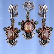 Set aus geschwärztem  Silber 925° mit Citrin (10 x 8 mm), Smaragden ¢ 2 mm., Rubinen ¢ 3 mm Das Set besteht aus Anhänger und Ohrhänger