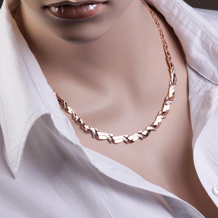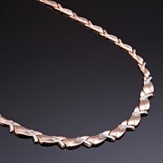 Элегантное объёмное колье из русского красного и белого золота 585 пробы замечательно украсит изящную женскую шею и грудь.