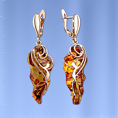 Schöne Ohrhänger aus massiven 585er (14kt) russisches Rotgold gestaltet mit je einem großen zargefassten Bernstein (ca.32 x 12 x 6 mm). Die rechteckige Bernsteine bilden den harmonischen Blickfang in einem warmen Tönen. Die gesamten Ohrhängermessen ca.50 x 15 mm sind ausgestattet mit Stift und Klappbrisur und nur bei durchstochenen Ohrläppchen tragbar.