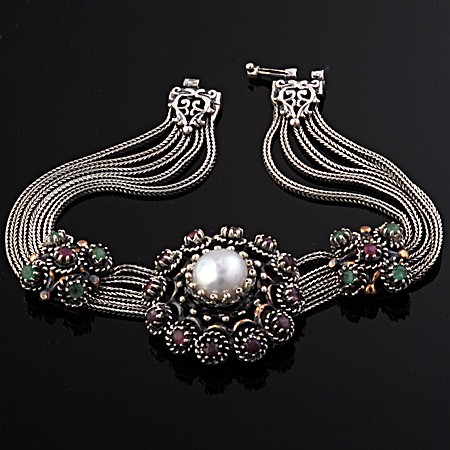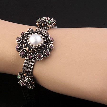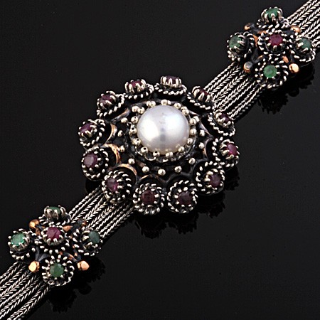 Eine stilvolle und luxuriöse Schmuck - Armband mit Perle ¢ 10,0 mm, Rubinen ¢ 3,0 mm,  Smaragden ¢ 3,0 mm. Silber 925°. Bronse. Lange 19 cm