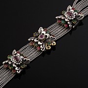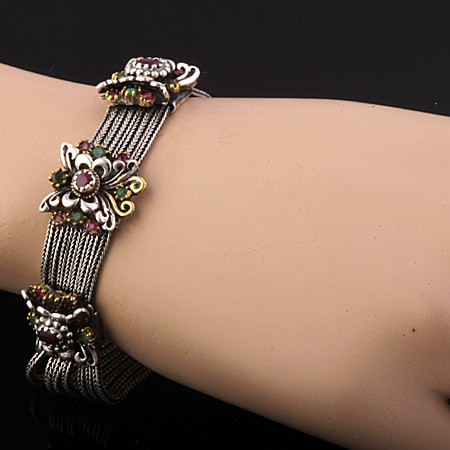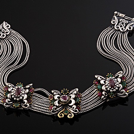 Eine stilvolle und luxuriöse Schmuck - Armband mit 2 Rubinen (5 x 3 mm), Rubin ¢ 3,0 mm, 12 Rubinen ¢ 2,0 mm., 12 Smaragden ¢ 2,0 mm. Silber 925°. Bronse. Lange 18,0 cm