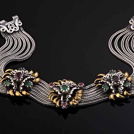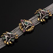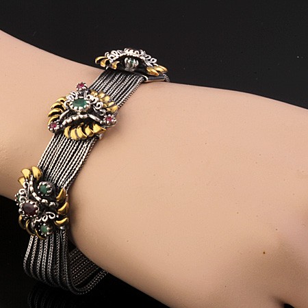 Eine stilvolle und luxuriöse Schmuck - Armband mit 2 Rubinen (5 x 3 mm), 3 Rubinen ¢ 2,0 mm, Smaragd (5 x 3 mm), 6 Smaragden ¢ 3,0 mm. Silber 925°. Bronse. Lange 18,0 cm