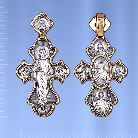 Центральным образом креста, выполненного в изысканной византийской форме, является величественная фигура Господа Вседержителя с двумя поклоняющимися Ему архангелами. Оборот посвящен иконе Пресвятой Богородицы «Троеручица».