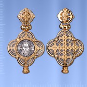 Более всех Божиих угодников в России почитается свт. Николай, епископ города Миры († 342). Его икона помещена внутри мощевика в верхнем круге. При жизни святой укрощал штормы, исцелял больных, предсказывал будущее и не раз являлся за сотни километров нуждающимся в его помощи. Одно из первых и самое знаменитое его чудо было совершено на пути в Иерусалим, когда святой воскресил сорвавшегося с мачты матроса (пам. 22 мая и 19 декабря).