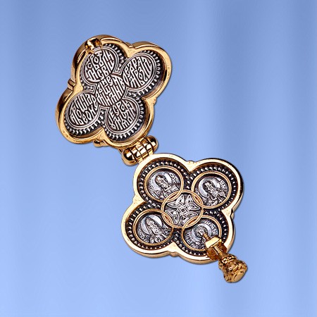 «Господи, во свете лица Твоего пойдем и о имене Твоем возрадуемся во веки», — словно бы молятся святые словами из Службы Нерукотворному Образу, написанными рядом с их иконами внутри мощевика. «О Крест Христов, блистательнейшее озарение всего мира! — восклицает другой великий святой прп. Феодор Студит († 826). — Обильная благодать предложена всем; указан источник, из которого проистекает освящение и который никого не лишит обильных благ».