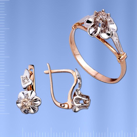 Бриллианты на кольце и на серьгах закреплены открытой закрепкой на возвышенных золотых крапанах, что особенно подчёркивает красоту камня и позволяет ему сверкать завораживающим блеском.