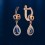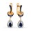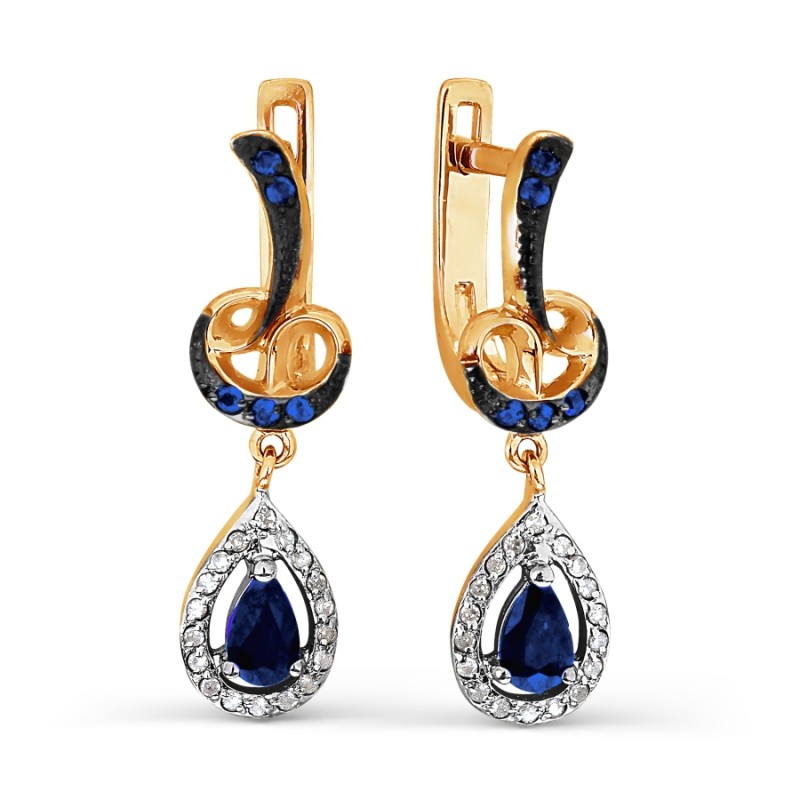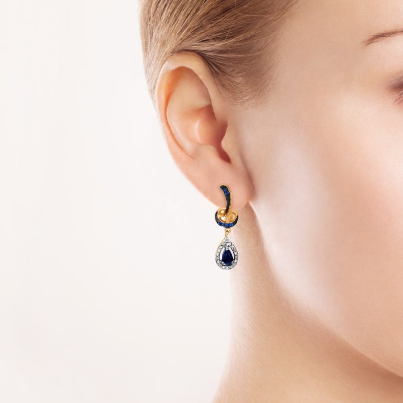 Die Basis der Ohrringe am englischen Schloss ist partiell geschwärzt und mit zehn Saphiren besetzt. Auf dieser Basis ist ein tropfenförmiger unterer Teil der Ohrringe, verziert mit relativ großen Saphiren und Diamanten, an einer freien Aufhängung befestigt.