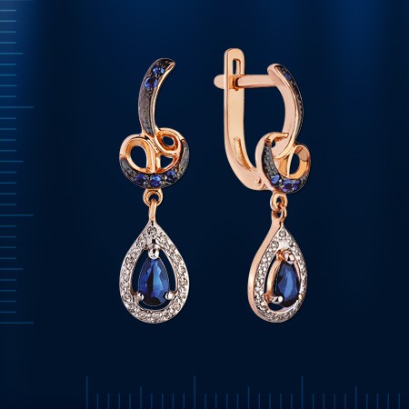 Bezaubernde sinnliche Ohrringe - Anhänger in Weiß- und Rotgold 585 mit Brillanten und natürlichen Saphiren. Die Besonderheit dieser Ohrringe ergibt sich auch aus der partiellen Schwärzung von Details, die mit Hilfe neuer Technologien auf Gold aufgebracht wurden. Eine großartige Kombination aus Gold und der überirdischen Schönheit eines Steins - Saphir - kann jeden erobern. Das unübertroffene Blau des Saphirs, seine wunderbare Ausstrahlung, lassen Sie diesen Stein immer wieder bewundern.