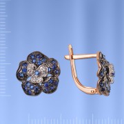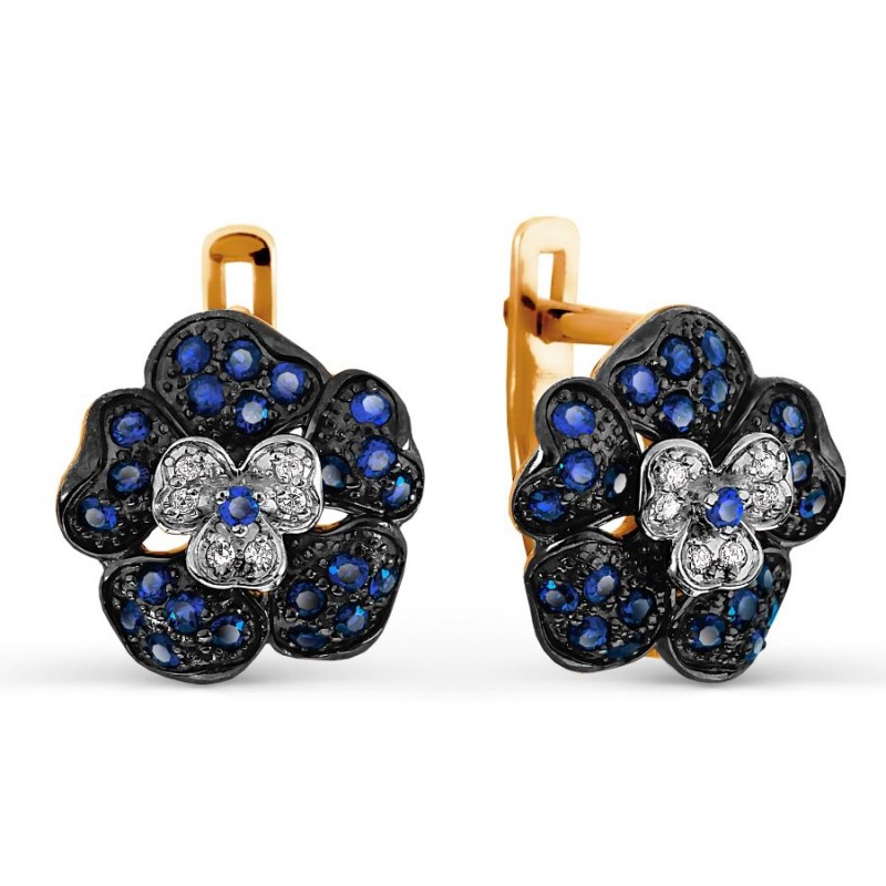 Очаровательные оригинальные серьги из белого и красного русского золота585 пробы, украшенные бриллиантами и сапфирами. Особенность этим серьгам придаёт так же частичное чернение деталей, нанесённое на золото, с помощью новых технологий. Эти серьги - роскошный подарок любимой! Годы идут, меняется мода, но золотые серьги по-прежнему привлекают своей свежестью и красотой.