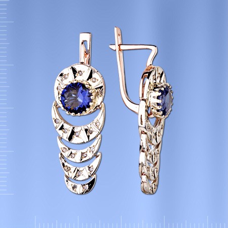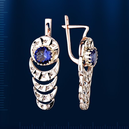 Очаровательные чувственные серьги - подвески из белого и красного золота585 пробы с бриллиантами и сапфирами. Особенность этим серьгам придаёт так же частичное чернение деталей, нанесённое на золото, с помощью новых технологий.