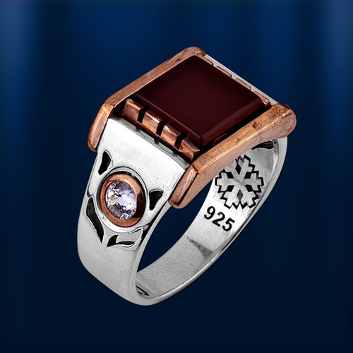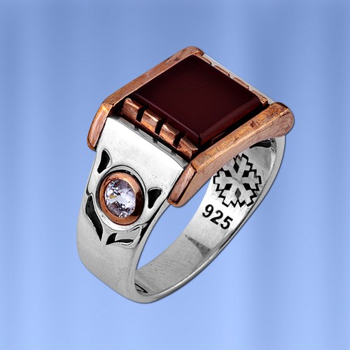 Кольцо украшено крупной плоской вставкой из темно-красного сердолика (10.0 х 10.0 мм) и двумя сверкающими
