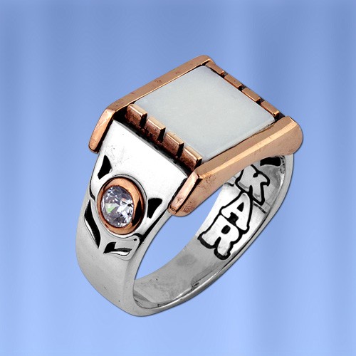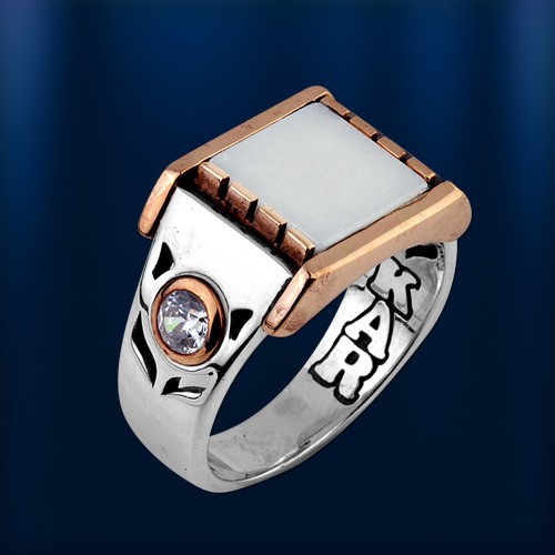 Кольцо украшено крупной плоской вставкой из белого оникса (10.0 х 10.0 мм) и двумя сверкающими