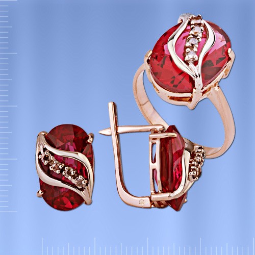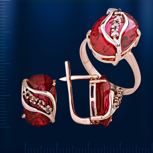 Восхитительные украшения, с первого взгляда пленяющее интересным исполнением и сиянием камней: рубинов и бриллиантов. Необычайно красивые, оригинальные серьги и кольцо в любой обстановке сможет подчеркнуть выразительность и изящность женского образа!
