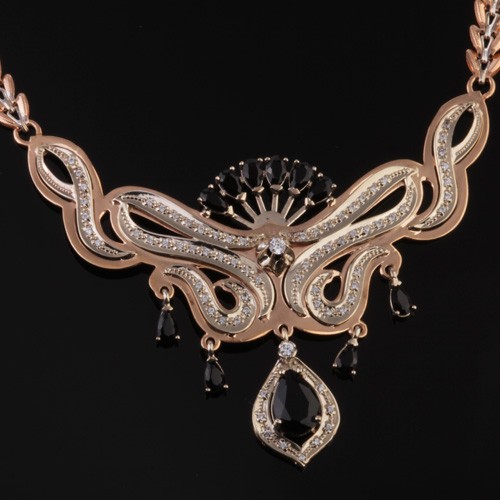 Великолепное украшение, которое может стать изюминкой вашего образа, подчеркнуть вашу миловидность и обаяние! Это прекрасное колье – хорошее дополнение вашему вечернему образу. Роскошные гранаты, сложенные веером на основе из красного золота, напоминают необычный цветок, а вставки из белого золота, сверкающие фианиты, подчеркивают плавность и мягкость изгибов колье.