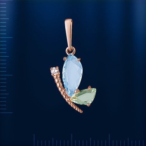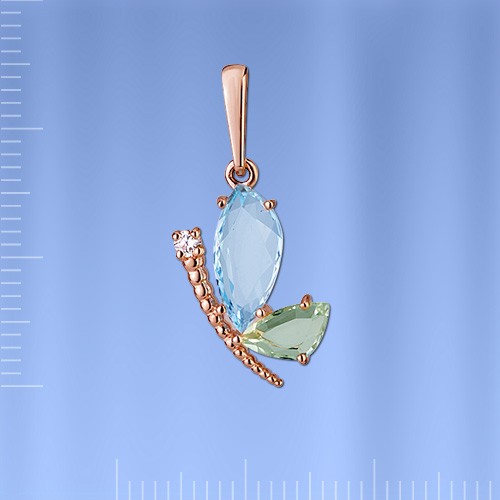 красного золота 585° в форме бабочки и украшена нежно - голубым топазами и светло- зеленым