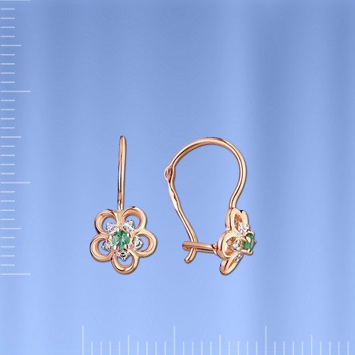 Вставки: 10 бриллиантов 10Кр17 0,034 2/3А, 2 изумруда диаметром 2,0 мм 0,053 карат 3/3 круглые. Камни надёжно закреплены на золотых крапанах открытой крепкой, что позволяет камням красиво играть падающим светом.