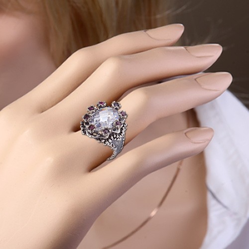 Вставка: нежно - сиреневый фианит (18.0 х 13.0 мм), 8 рубинов ¢ 3.0 мм