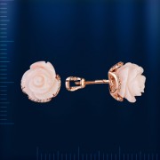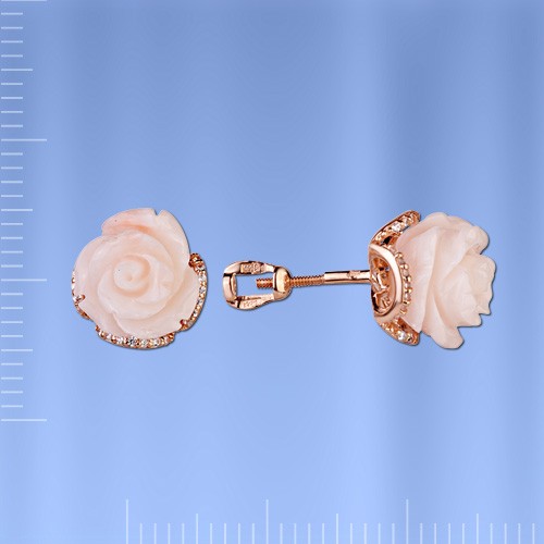Нежные романтичные серьги - пусеты с резными кораллами в виде бледно - розовой розы, украшены сверкающими