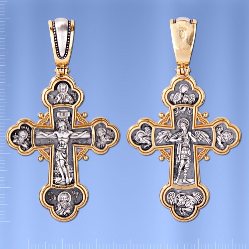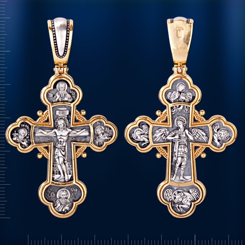 В центре оборота креста изображен Архистратиг Михаил. Могучий Архангел почитается как покровитель воинов и всех верных Богу и ведущих борьбу против сил зла, а также защитник душ умерших, страж райских врат.