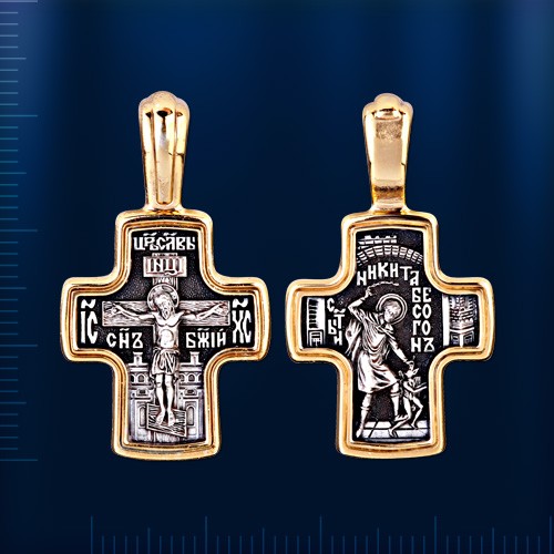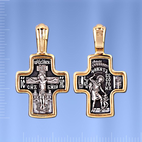 На лицевой стороне креста изображено Распятие Господа нашего Иисуса Христа. На обороте помещена икона святого мученика Никиты Бесогона. По преданию святой был сыном царя- зычника, который мучил его и бросил в темницу за приверженность христианству. В темнице святому явился бес в виде Ангела Света и стал уговаривать его поклониться языческим богам,чтобы сохранить себе жизнь. Никита разгадал обман и избил беса своими кандалами. После этого он привёл беса на суд, чтобы показать отцу, кому он поклоняется. Там же, в присутствии тысяч людей, воскресил давно умерших супругов. Царь не захотел поверить, нонарод вынудил его отпустить Никиту, который вскоре скончался отполученных ран. Никита Бесогон традиционно считается одним из самых сильных защитников от нападения тёмных сил