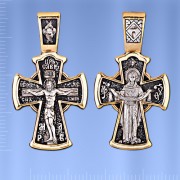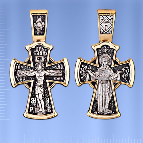 На лицевой стороне креста изображено Распятие Господа Иисуса Христа. На обороте — икона Покрова Пресвятой Богородицы. Праздник Покрова Божией Матери является воспоминанием чуда, которое произошло во Влахнернской церкви 1 (14) октября 910 года: Пресвятая Богородица явилась верующим над алтарем храма и распростерла над ними Свое покрывало. В этот день Божья Матерь открыла людям, что Она является Ходатаицей за них перед Богом. Богородица простирает Свой молитвенный покров над всеми православными христианами и умоляет Сына Своего о даровании вечного спасения каждому человеку