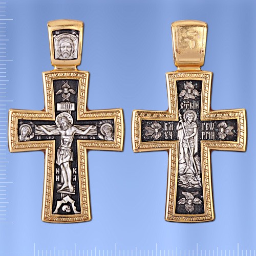 На лицевой стороне изображено Распятие Господа Иисуса Христа. С двух сторон ему предстоят Пресвятая Богородица и св. пророк и Предтеча Господень Иоанн Креститель, имеющие особое дерзновение перед Богом молиться за всех людей. Иконы, где они изображены молящимися Христу, называются деисус, что значит «моление». На обороте — великомученик Георгий Победоносец, один из наиболее почитаемых святых в Христианской Церкви. На Руси он известен как Юрий или Егорий, покровитель воинов, помощник в крестьянском труде, защитник в бедах, духовный помощник в невидимой брани с силами зла