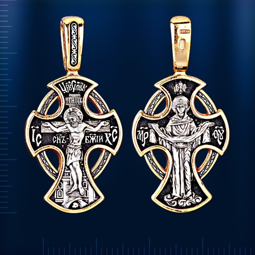 На лицевой стороне креста изображено Распятие Господа Иисуса Христа. На обороте — икона Покрова Пресвятой Богородицы. Праздник Покрова Божией Матери является воспоминанием чуда, которое произошло во Влахнернской церкви 14 октября 910 года: Пресвятая Богородица явилась верующим над алтарем храма и распростерла над ними Свое покрывало. В этот день Божья Матерь открыла людям, что Она является Ходатаицей за них перед Богом. Богородица простирает Свой молитвенный покров над всеми православными христианами и умоляет Сына Своего о даровании вечного спасения каждому человеку