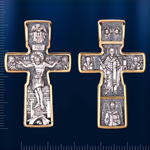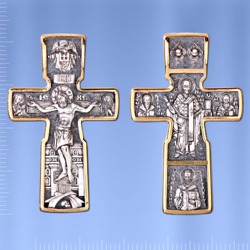На лицевой стороне креста изображено Распятие Господа Иисуса Христа. С двух сторон Христу предстоят Пресвятая Богородица и святой пророк Иоанн Креститель, Предтеча Господень, главные защитники и молитвенники за людей перед Богом. На оборотной стороне в центре изображен святитель Николай, которому молятся во всех житейских обстоятельствах и духовных нуждах. Вокруг — иконы трех святителей, творцов Литургии. Слева — святой Василий Великий, внизу – святой Иоанн Златоуст, а справа — святой Григорий Богослов. На ухе изображены два серафима, огненных ангела, ближе всех стоящих к Богу