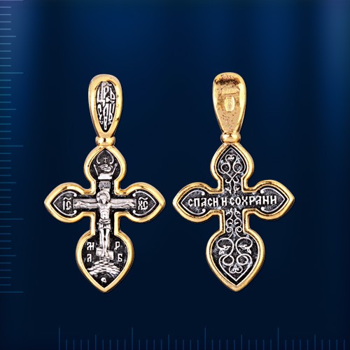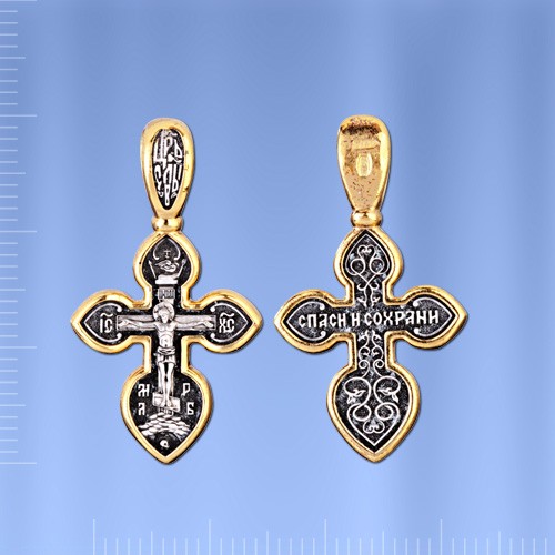 На лицевой стороне креста изображено Распятие Господа нашего Иисуса Христа. На обороте — короткая молитва, обращенная к Господу, которая традиционно помещается на нательных крестах: «