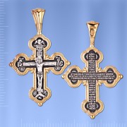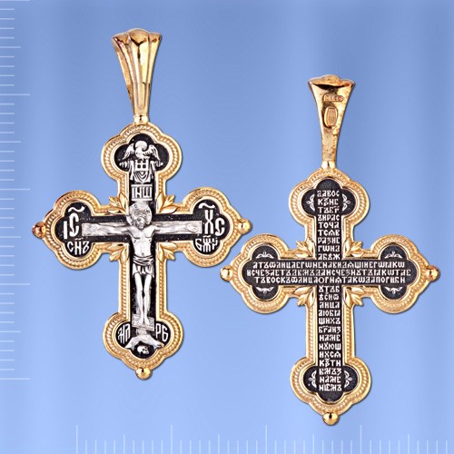 На лицевой стороне креста изображено Распятие Господа нашего Иисуса Христа. На обороте — короткая молитва, обращенная к Господу, которая традиционно помещается на нательных крестах: «