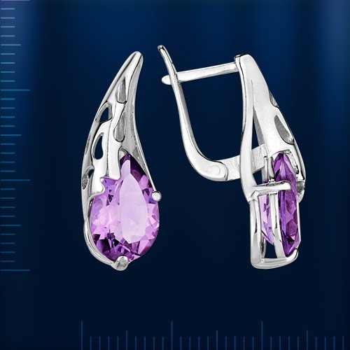 Серебро родировано. Родий не темнеет на воздухе и поэтому родирование применяется для защиты серебряных изделий от потемнения, а также в ювелирном производстве его используют в качестве защитно-декоративного покрытия. Это самый яркий и твердый металл из всей платиновой группы Серьги с аметистами – это очень необычный и изящный вариант украшения, который вы смело можете носить каждый день. Более того, специалисты рекомендуют одевать этот камень именно днем, такт как при солнечном свете Аметист способен порадовать и заворожить вас всеми своими необыкновенными оттенками: от нежного сиреневого до темно-фиолетового.