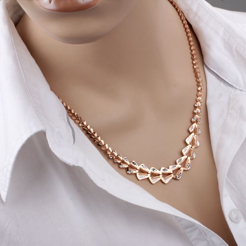 Элегантное объёмное колье из русского красного и белогозолота585 пробы замечательно украсит изящную женскую шею и грудь.