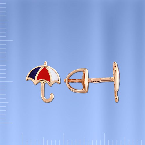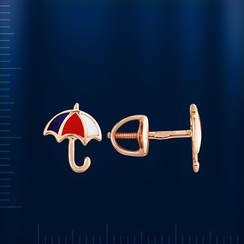 Миниатюрные серьги - пусеты в форме ярких зонтиков из красного золота 585 пробы покрытых цветной эмалью