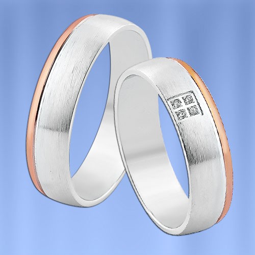 Оригинальное и модное двухцветное обручальное кольцо из красного и белогозолота 585 пробы с бриллиантами ( 4 х 0,005 карата)(матовая поверхность)